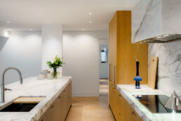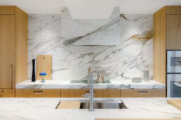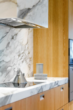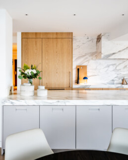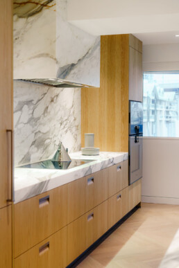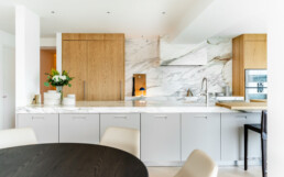 This project came together through close collaboration with Burjen Enterprises and Mulder Contracting, with expert cabinetry installation by BK Installs, custom stone surfaces by MW Stoneworks, and state-of-the-art appliances by Gaggenau. Each partner played a vital role in ensuring the kitchen integrates seamlessly within the condo’s modern urban setting, where craftsmanship meets precision at every detail.