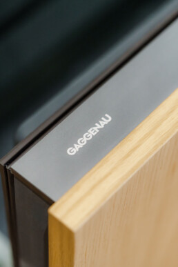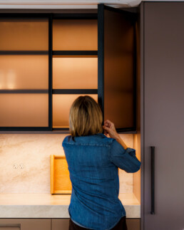 The Arclinea “Italia” lacquer pantry, with its elegant handles and refined detailing, is paired with a Gaggenau wine refrigerator and custom countertops by MW Stoneworks. Together, these elements balance sophisticated design with everyday practicality, reflecting Italian craftsmanship and effortless modern living.