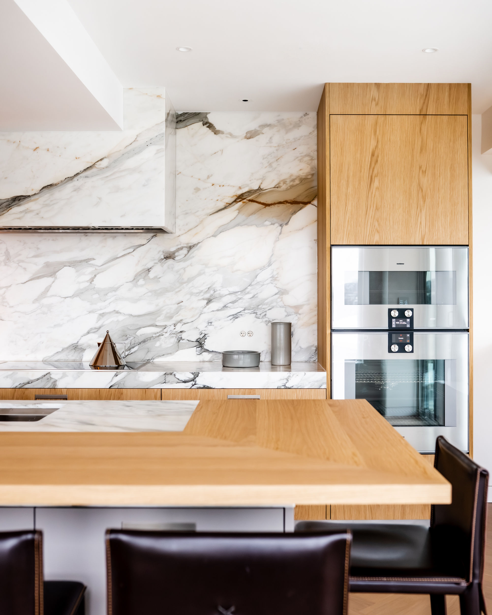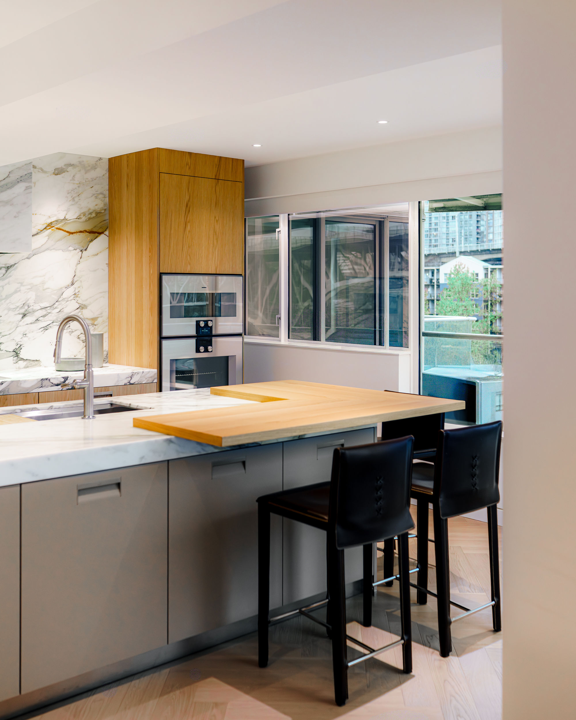 This project came together through close collaboration with Burjen Enterprises and Mulder Contracting, with expert cabinetry installation by BK Installs, custom stone surfaces by MW Stoneworks, and state-of-the-art appliances by Gaggenau. Each partner played a vital role in ensuring the kitchen integrates seamlessly within the condo’s modern urban setting, where craftsmanship meets precision at every detail.
