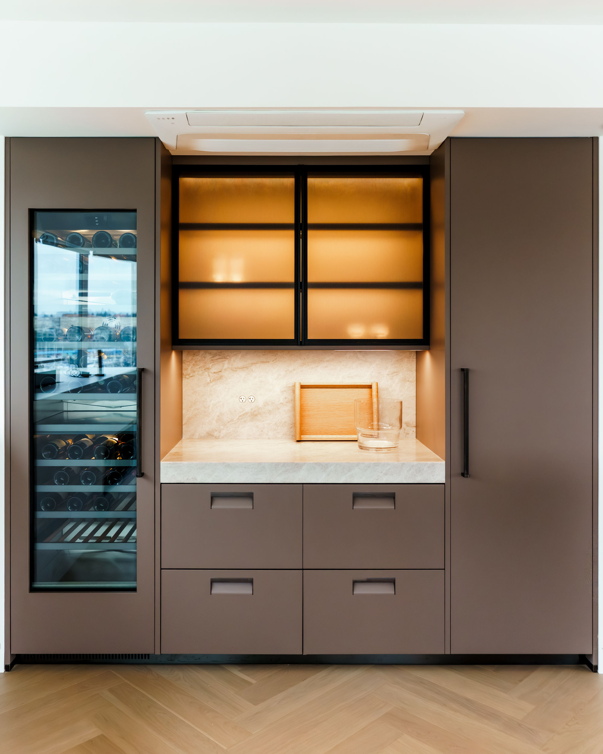 The Arclinea “Italia” lacquer pantry, with its elegant handles and refined detailing, is paired with a Gaggenau wine refrigerator and custom countertops by MW Stoneworks. Together, these elements balance sophisticated design with everyday practicality, reflecting Italian craftsmanship and effortless modern living.